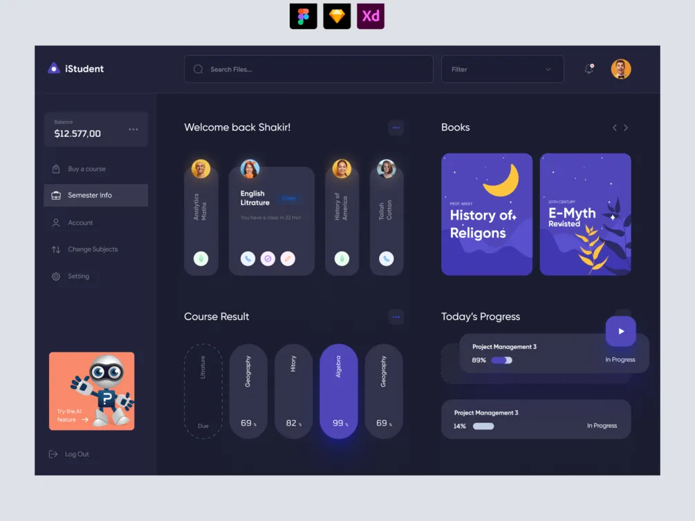 This comprehensive University Student Dashboard Website (Dark theme) featuring modular components will help you build better, consistent, high-quality design. Download free dashboard ui kit for banking. This free University Student Dashboard Website (Dark theme) is avaialble for Adobe XD, Figma and Sketch. This modern and free University Student Dashboard Website (Dark theme) can be edited or customized in your favorite design tool.